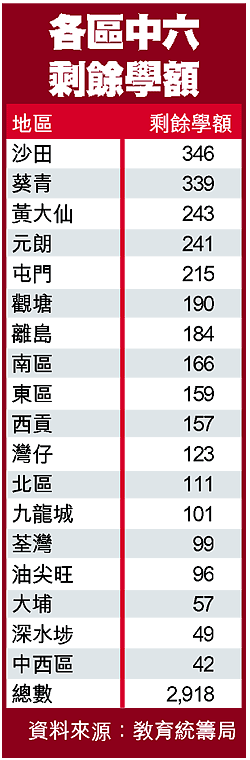 餘下的中六學額以沙田及葵青區最多,各有三百多個。今日只有南區聯招中心繼續運作,提供一百四十八個學位,昨晚已有逾百學生在外通宵排隊。