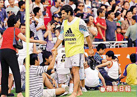 昨日操練原定早上十時開始,皇馬教練基羅斯直到十時二十分才到場視察草地並擺放練習設施,而球員則待十一時零九分才施施然出場。當卡洛斯首先從球員通道步出,其他球星也陸續進場時,大球場內氣氛霎時間變得熾熱,掌聲及歡呼聲不絕於耳。