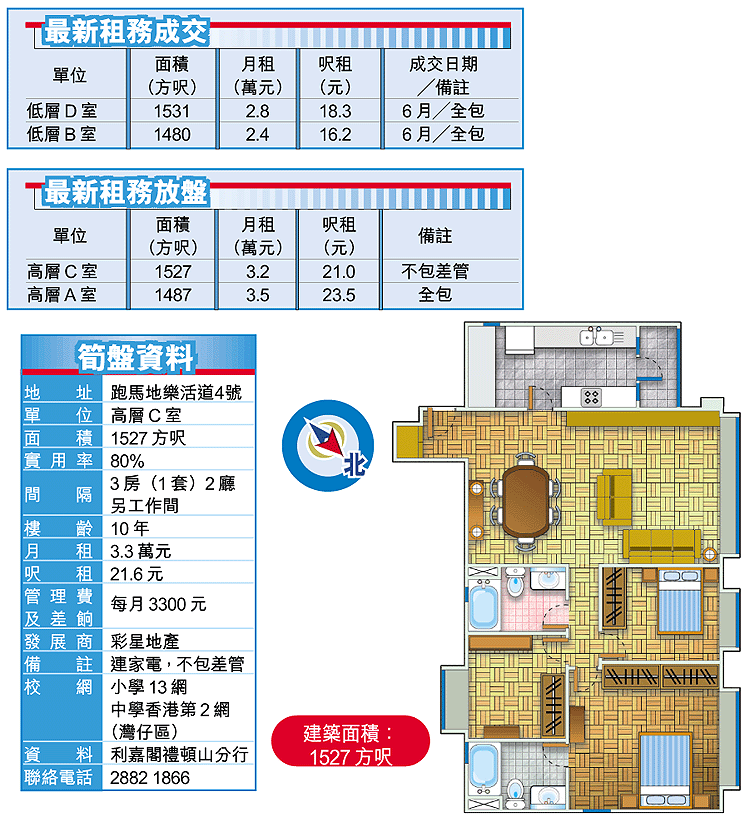 利嘉閣莫禮信指出,樂活臺C及D室均逾千五方呎,其中高層租盤僅兩個,租金相若,同樣不包差餉或管理費,但筍盤內櫳保養較為企理,而附連的家電也較齊全。