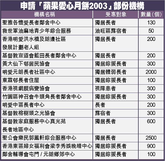 蘋果日報慈善基金為資助社會服務機構送贈月餅給弱勢社群,特別成立「蘋果愛心月餅專戶」。今年呢個專戶到目前為止,已經收到接近五十間機構申請合共超過一萬八千個月餅,需求之大,可謂刷新歷年紀錄,蘋果基金將會因應專戶所收嘅善款來資助機構買月餅。