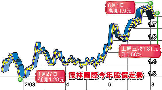 【本報訊】毛絨玩具生產商德林國際(1126)執行董事總經理及財務總監李泳模接受本報訪問時說,該公司上半年業績理想,因為02年度的定單部份延至今年才入帳;加上奪得對手定單,致令全球市場佔有率,由上年度的1.6%,升至近2%。