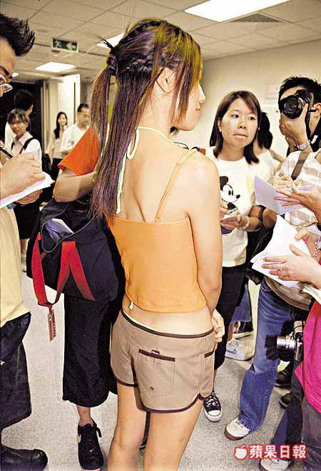 十二位佳麗昨日以小背心及超短褲站在模擬水池布景前作示範,布景更不時升高十多呎,其中15號陳榕梅、17號李嘉怡及18號李詩韻穿起超短褲時更露出半股,而7號王從希及10號譚靜雯穿起低腰短褲時則露出腰間豬腩肉。
