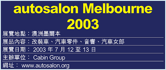 澳洲最大型的改裝車展「autosalon」,巡迴於澳洲5大城市,新西蘭及印尼雅加達等地展出。車展網羅了最獨特、外型美輪美奐的改裝車,展現最新的改造技術、引擎組件及音響等設備。今年最後一次展出會在悉尼舉行,屆時將聚集各地選出的十大改裝車,再決勝負。
