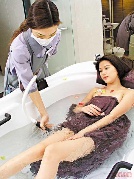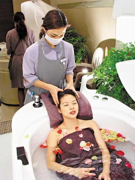 肥胖多是淋巴不通所致,可利用浸SPA水療來改善血液循環和排走毒素!先在放滿香薰油、花瓣、檸檬片的恒溫水缸浸浴,然後美容師會將小水柱由腳底經腿部,把廢物經淋巴結帶走,達到排毒、去除水腫效果!此外,背部的小水柱亦同時開動,能令中樞神經放鬆。