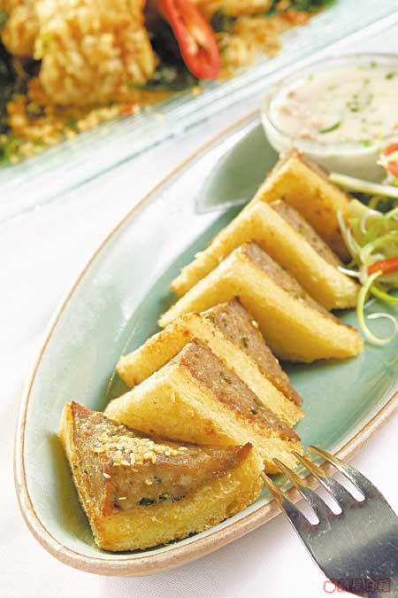 傳統的泰菜頭盤,用了鮮蝦肉、瘦肉和肥豬肉,加入芫荽碎,再將之油炸。醬汁最為特別,用了椰奶、豬肉碎同埋芫荽,製造一鹹一甜的味道,是餐廳最受歡迎的頭盤之一。