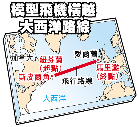 七十七歲的美國退休工程師希爾,十年前已有製造一架模型飛機橫越大西洋的夢想,他周一夢想成真了。他設計的模型飛機,飛行了三千零三十五公里,由加拿大飛越大西洋,成功在愛爾蘭着陸。他和他的模型飛機「發燒友」朋友,更向國際航空聯合會申請確認這次壯舉打破了模型飛機飛行時間和航距最長的世界紀錄。