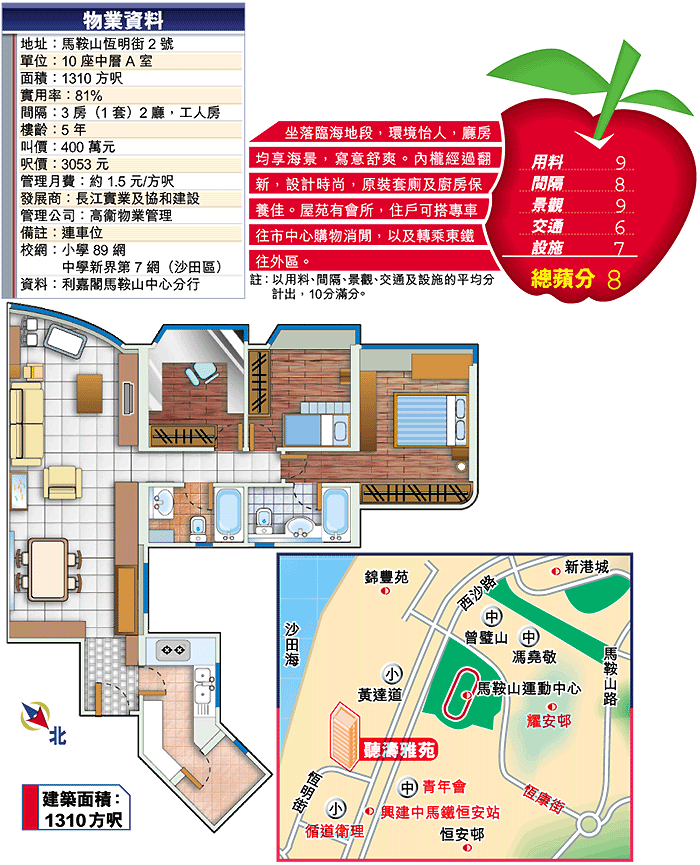 馬鞍山聽濤雅苑最大單位為1310方呎,今次介紹的正是此類,內櫳寬廣之餘,更位處單邊,坐擁無擋沙田海美景,對岸是中文大學及綿延群山,有山有水,又有書卷氣。