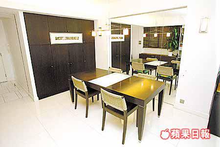 客廳特設弧形落地窗,甫入屋如畫景致即呈現眼前。戶主重本將廳房大翻新,分別鋪地磚及深色木地板,度身訂做大櫃,當中飯廳貯物櫃饒富特色,櫃門中央圍上金屬框。此外,客廁換上圓形金屬洗手盆,令人眼前一亮。