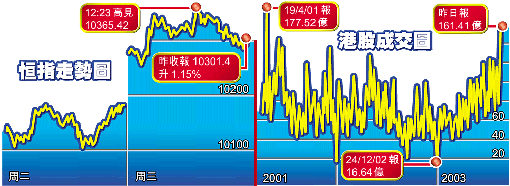 恒指昨收市報10301點,升117點,全日成交額更急增至161億元,是自01年4月19日成交額達177.5億元以來最多,單是藍籌股的成交額已達73.7億元,佔大市總成交45.6%。即月期指昨收報10231點,升131點,低水70點,成交合約26339張。