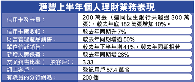 柯清輝昨日指出,上半年度滙豐香港在「惡劣」經營環境下,盈利及業務銷售表現理想,尤其是信用卡業務發展,過去3年發卡量增長逾1倍,至200萬張。該銀行上半年應收帳較去年同期升7%,但市場平均減逾一成。他預期下半年度銀行業經營前景審慎樂觀,盈利增長會更佳。