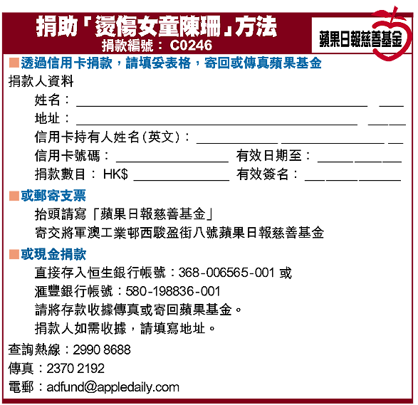 十歲的陳珊,原居於廣東河源市和平縣林寨鎮,三歲的時候不慎被滾水燙傷,從此飽受皮肉折磨;出身農戶的她,為尋求適切的治療,前年底隨母親來港求醫,並在熱心善長捐助下,先後動過兩次手術及接受其他專業治療,病情一度有好轉,惟近月情況惡化,需要再度進入手術室。年紀輕輕的珊珊,面對漫長的治療歲月,急需善長繼續施予援手,助她跨度逆境。