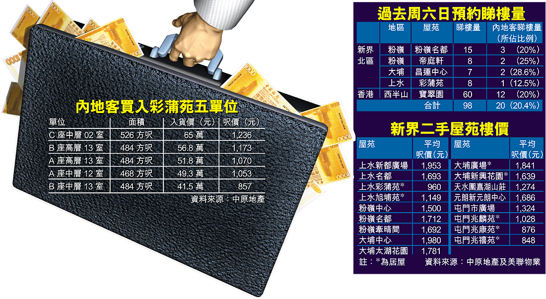 中原地產上水中心分行經理賴作智表示,近年一直都有一批中港兩地往來做生意的內地人,於北區一帶租樓住,佔租務成交約百分之六至十,然而真金白銀買樓的則比較少見。一名持中國護照的深圳商人日前到該分行,指明要買些近火車站、回報率高的物業。經分析後,客人認為距上水火車站約五至十分鐘行程的彩蒲苑最為適合,因為該屋苑平均月租達三千三百多元,回報率達七至九厘,反而同區相若行程的私樓上水中心,回報率只得約四厘左右,於是「扑鎚」成交。
