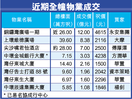 【本報訊】成為投資物業市場焦點的銅鑼灣廣場一期,有逾十個財團競逐,結果由永安集團的附屬永安地產證券,以12億元高價奪得,是今年最大宗全幢物業易手個案。