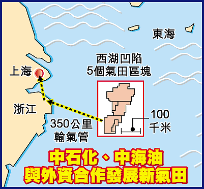 【本報訊】中國石油化工(386)及中國海洋石油(883)宣布,聯手投資西湖凹陷氣田5個區塊,各佔30%權益,中海油出任作業者,荷蘭殼牌及美國優尼科(UNOCAL)各佔20%權益。該氣田兩個已開發區塊的探明儲量為2萬億立方呎,約3.45億桶油當量,需投資10億美元(78億元),05年中投產,餘下三個區塊則在勘探中。