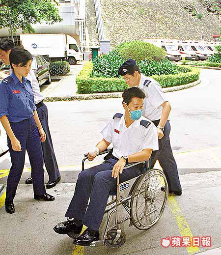 【本報訊】一名患躁狂症姓鄭(六十歲)男子(圖一中),昨晨十時許因腳傷自行往青衣長康邨診所求診,需轉介往瑪嘉烈醫院醫治。 救護員在診所外將他送上救護車時,他突然情緒激動,聲稱要返家取物件;救護員勸止時,他涉嫌將其中一名姓吳(二十六歲)救護員推跌地上;吳右手腕扭傷(圖二)送院。鄭翁涉嫌毆打公職人員被捕。 陳天華攝