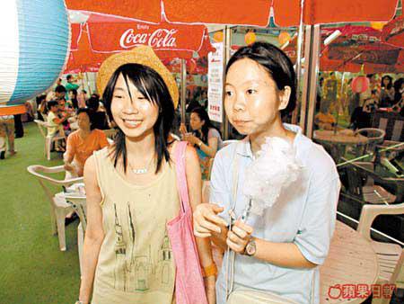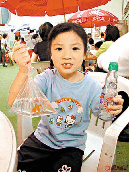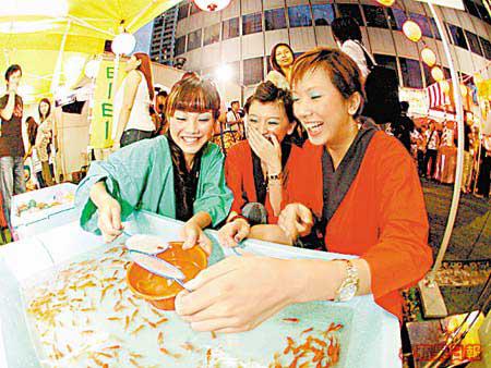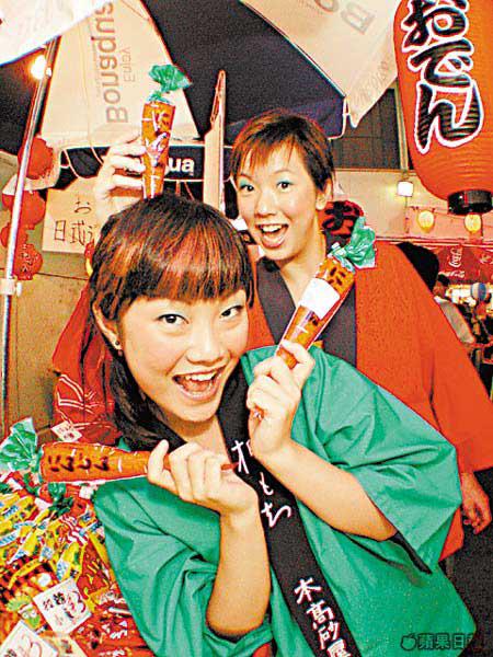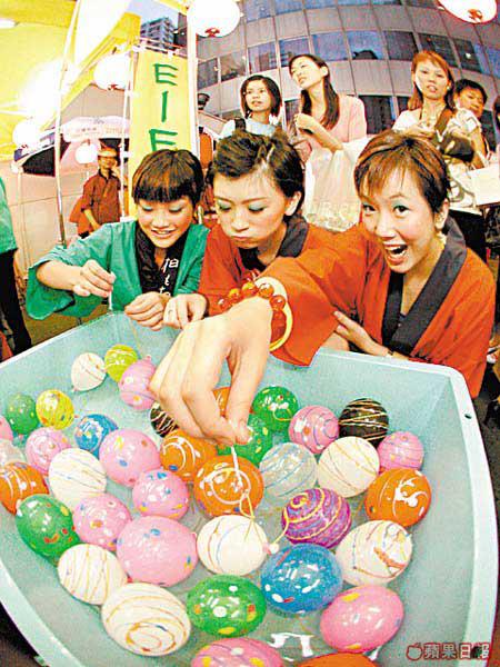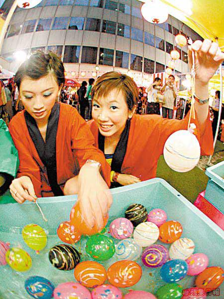 心目中的日本祭以玩樂為主,穿上和服的日本女郎必定在極富特色的金魚池撈金魚,所以入到祭場,我與一眾Model第一時間便往金魚小檔。小檔有兩種玩意,一項是典型撈金魚,另一則是釣水球。既然有新玩意,當然離棄金魚伯伯,先玩釣水球。這玩意難度其實都幾高,「魚桿」是一條穿上鐵鈎仔的和紙條,和紙一濕便溶,再加水球的重量,釣時要快手快腳,否則一斷便GameOver。