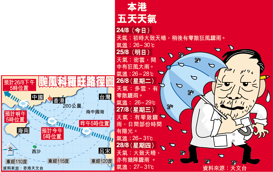 天文台在昨日上午九時三十一分發出一號戒備信號,昨日下午七時,颱風科羅旺集結在香港東南偏南約六百二十公里,向西北偏西移動,時速約二十公里,橫過南海北部。而據天文台的資料,科羅旺是柬埔寨提供的熱帶氣旋名稱,意思是一種樹木名。