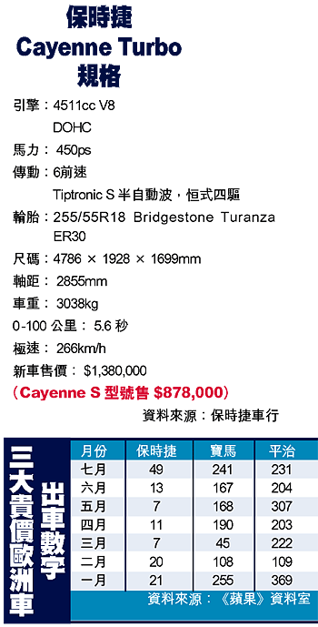 保時捷成為淡市奇葩,主因是車廠最新款的四驅車Cayenne付運抵港,模特兒公司老闆鄒世龍是首批車主之一,上月剛收到新車,一談起這部「新玩具」他便滔滔不絕,「Cayenne係Porsche第一部真係坐到四個人嘅車,我有兩個細路,一家四口都坐得落。」Cayenne交車令保時捷上月出車量飆升,扣除二十七部Cayenne,其他型號亦有二十二輛落地,可見銷路已回復正常。