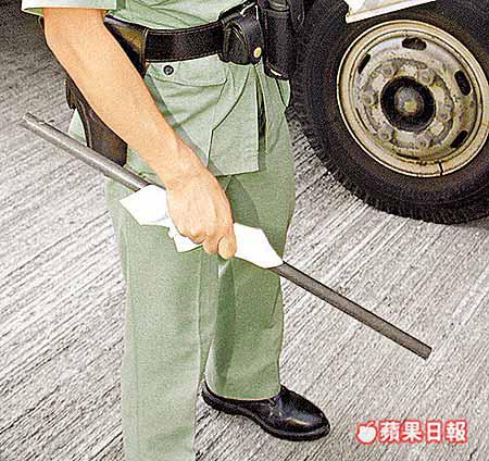 【本報訊】五十歲姓李貨車司機,昨晨十時,駕駛載着竹棚的貨車停泊於西環均益大廈三期對開干諾道西路邊等候落貨,一輛密斗貨車駛至並停泊在其貨車前面,車上赤裸上身的司機下車,態度惡劣地要求李將車倒後,由於密斗貨車前面仍有很多空位,李遂加以拒絕,雙方一言不合發生爭執。其間有人拾起一支兩呎長鐵通擊毀李的車窗玻璃,警方事後到場將涉嫌刑毀的二十八歲姓黃惡司機拘捕(圖一),並撿走鐵通(圖二)。 簡明恩攝