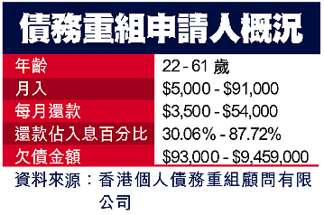 香港個人債務重組有限公司副總裁李家輝指出,該公司處理的九百六十三宗個案中,有六成為任職私營機構專業人士,其餘四成則為任職公營機構人士或公務員。