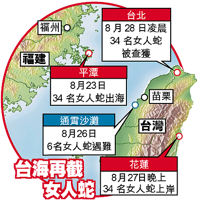 台灣昨日再揭發蛇頭將三十四名女人蛇推落海、要她們自行上岸,所幸未釀成死亡。這是台灣今年查獲人數最多的一宗人蛇案。這批人蛇已在海上漂浮四天,前日深夜在花蓮被蛇頭推落水深及胸的海中,蛇頭並威嚇她們:「不要亂叫,否則淹死你」。