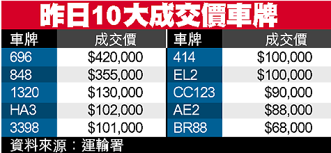 昨日成交價最高是無字頭車牌「696」,由公司東主王先生以高出底價一倍的四十二萬元投得。他表示,6字是他的幸運號碼,故他願出高價競逐心頭好。他又以九萬元轟走對手,投得車牌「CC123」,「CC係我公司縮寫,而123加起嚟又等如6!」