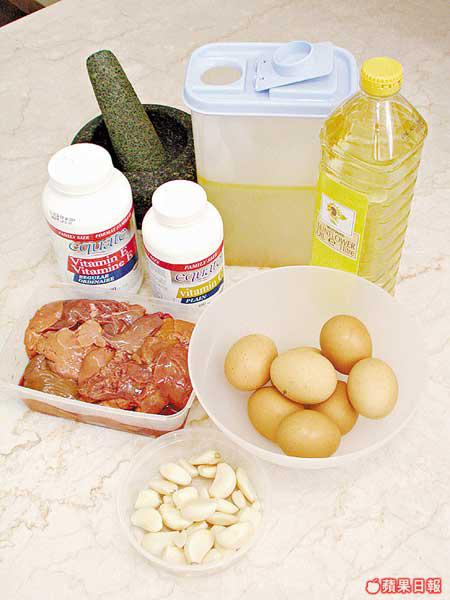 1.將雞肝、蒜茸、蛋、搗碎的維他命C和溶解維他命E的雞湯置於攪拌機打碎。