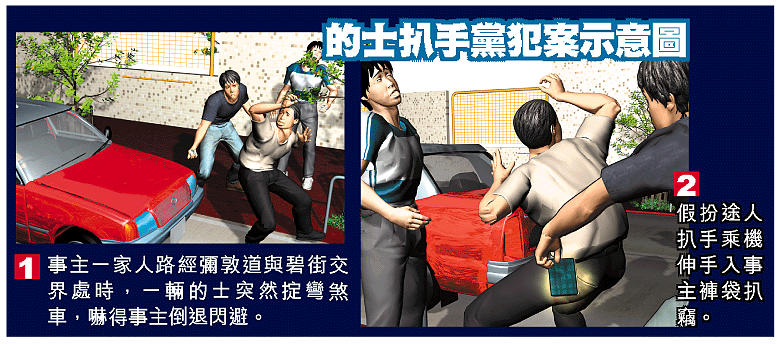 事主稱,昨晨八時許他與家人沿彌敦道步行往尖沙嘴購物,橫過碧街交界時,一輛停在路口的士突然駛來,嚇得各人倒退閃避。此時一名頭髮呈「地中海」的男子乘亂伸手入事主褲袋扒去一叠鈔票。