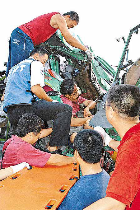 昨晨五時半,台灣一輛小貨車沿中山高速公路向南行駛,在中部彰化縣路段突失控翻車,隨後的十四輛汽車收掣不及連環追撞,造成三死三傷。(圖一)一輛密斗貨車車頭撞至嚴重變形,被困的司機(圖二)被救出時已奄奄一息。 台灣《蘋果日報》