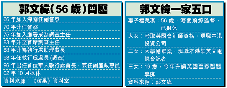 郭文緯是廉署成立第一批調查主任,當年經常早上七時拍門叫人返廉署飲咖啡協助調查。一做二十八年。去年底退休時,他已高升至廉署執行處首長,是首位華人擔任這個職位。架構上,他僅次於廉政專員;實際上,則是調查工作最高領導,是廉政公署頭號狙擊手。