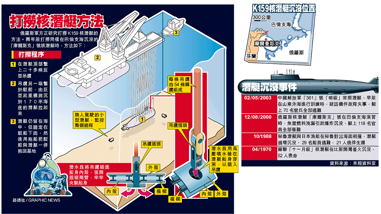 俄羅斯十多天前剛舉行核潛艇「庫爾斯克」號爆炸沉沒三周年悼念活動,但昨晨再度發生同類悲劇。已退役十四年的海軍北方艦隊K159核動力潛艇,被拖往船廠拆卸途中,於巴倫支海遇到風暴沉沒,十名船員中一人獲救,其餘九人都葬身怒海。潛艇上有核燃料,但無攜載武器,軍方指現場一帶輻射水平正常。