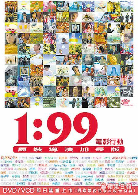 由本港導演韋家輝、杜琪峯、陳果、陳德森、徐克、周星馳、馬偉豪、羅啟銳、張婉婷、林超賢、陳嘉上、謝立文、陳可辛、劉偉強和麥兆輝執導的抗炎短片《1:99電影行動》,近日推出VCD,每張售十九元九角,DVD則於日內推出,每張售約五十九元,所有賣得款項將全數撥捐慈善機構,幫助早前受到非典影響的人士。