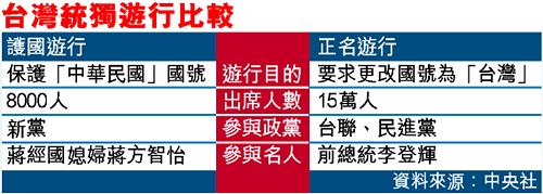 在台獨人士前天舉行十五萬人的「台灣正名」大遊行、要求將國號改為「台灣」後,中華教授協會等民間團體昨日亦發起「民間保護中華民國大聯盟」遊行(簡稱護國遊行),吸引了約八千人參與,已故總統蔣經國的媳婦蔣方智怡也走上街頭,呼籲市民維護「中華民國」的國號。