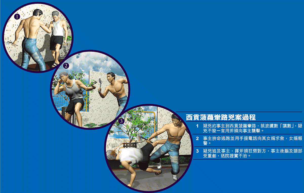 事主昨日被誘到西貢菠蘿輋路講數,不料被人用利斧襲擊,後腦幾乎被破開,頸部傷痕深可見骨,傷重倒卧地上,由行山人士發現報警,送院證實死亡。警方正追緝涉案兇徒下落。