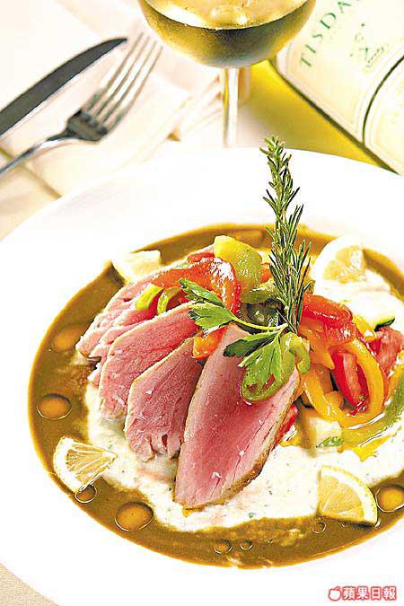 Andy說這是個清新一點的法國菜,以魚肉和蔬菜為主,好適合夏天食用,扒吞拿魚配青瓜乳酪中的沙律汁,是法式烹調法,吞拿魚配合特製的青瓜乳酪沙律汁食最適合不過,又香又滑。