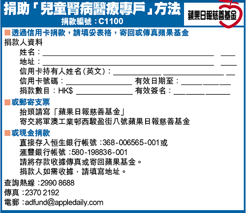 為減輕腎病兒童的經濟負擔,蘋果日報慈善基金與兒童腎病基金合作成立「兒童腎病醫療專戶」,募集善長捐款,目標為三十萬元,善款全數用作資助十多名像寶兒般病童一年的喉管費用。現時,兒童腎病基金已為三十多名家庭經濟有困難的腎病兒童提供洗腎喉管部份費用資助,敬希各界踴躍捐輸,支持病童勇抗病魔。