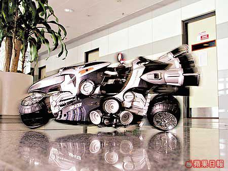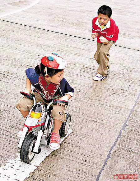 哥哥坐唔到架電動車,好在有遙控車玩。同樣是超人555,而身長40cm的電單車唔單止可以向前、後、左、右行,最強頑是可以打橫片。只需按左或右箭嘴掣,前後兩個車胎會打橫轉至接近水平位置,然後架車就可以打橫行。另外,若然按下遙控器上近天線位兩邊的按鍵,架車更會360度以高速原地自轉,勁!