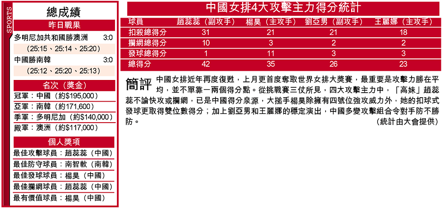縱使對手南韓未能構成壓力,中國女排昨在「盈科保險國際女排挑戰賽」展現出流暢及多變的進攻戰術,以三比○輕取對手,總成績三戰三勝未失一局勇奪冠軍,其中主攻手楊昊及副攻手趙蕊蕊更各獲兩個個人獎項,而落敗的南韓則以三戰二勝一負屈居亞軍。 文:盧漢傑