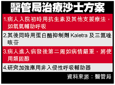 【本報訊】醫院管理局終於統一各間醫院的沙士治療方案,並決定不再單一採用三氮唑咳囗的治療方法,改用抗愛滋藥蛋白酶抑制劑Kaletra與三氮唑咳囗的混合療法,在新的「三級用藥」制度下,如病人病情轉為嚴重,便會使高劑量類固醇。