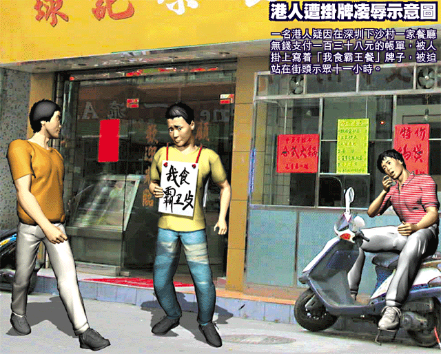 身上掛着「牛鬼蛇神」之類的牌子遊街示眾,原來不一定要在文革時期才可看到。一名香港人日前在深圳便嘗過了這種苦頭,他因為在一間餐廳吃飯後沒有錢付帳,被迫掛着「我食霸王餐」的牌子,通宵站在街頭示眾。