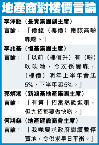 其他地產商則認為樓市開始復甦,恒基集團主席李兆基直指今次樓價上升,不再是「吹吹哋」,「今次(樓價升)係實」,李兆基更預期,明年上、下半年,樓價可以各升百分五,而且這個升勢會持續兩、三年,但一定要政府政策配合,政府毋須一定要暫停賣地,但一定不可以再賣樓價「重災區」土地,只能推出一些低密度住宅用地。