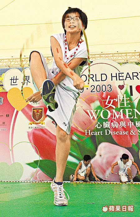 【本報訊】女士們或會害怕患上女性癌症頭號殺手「乳癌」,但原來女性因患上心臟病或中風而導致死亡的比率,較乳癌還要高。 為提升女性對心臟病的關注,昨天的「世界心臟日」主題集中在女性身上(圖一),並在維園舉行環球健步行及心臟健康嘉年華,推廣預防心臟病的訊息;其中運動,如跳繩是預防心臟病的最佳辦法之一,場內當然少不了跳繩花式表演(圖二)。 梁祖彝攝