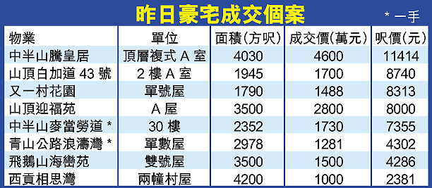 二手市場方面,放盤近兩年的中半山騰皇居頂層A複式單位,在近期豪宅市況轉好下,終成功以4600萬元易手,成交呎價更逾1.1萬元,造價理想。原業主於00年以4830萬元購入,帳面微蝕230萬元。