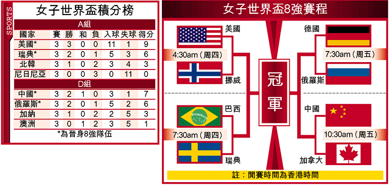 同日,已出線的東道主美國迎戰北韓,雖美國是戰收起了多位主力,但憑着出色的個人技術,最終以三比○擊敗北韓,以A組首名晉身八強對挪威。同組的瑞典亦以三比○勝尼日尼亞,以次名晉級,八強將遇巴西。