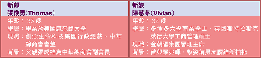 恭喜!恭喜!金朝陽太子女陳慧苓(Vivian)昨日與男友張俊勇(Thomas)拉埋天窗,兩人早上在聖母無原罪主教座堂行婚禮,晚上則在灣仔君悅酒店大宴親朋。