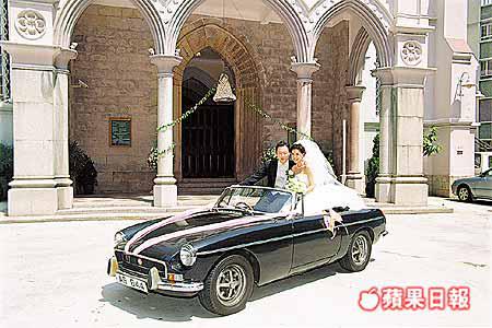 一對新人於九五年在鄭明明千金陳維蕊介紹下認識,昨日布置教堂的鮮花以TiffanyFlowers的純白色玫瑰花為主,伴以白繡球、白百合等,清新純潔。新人更特別找來一輛於六三年生產、被譽為「英國之寶」的MG開篷跑車作花車,據悉這部古董車全港只得十多部,而能正常開動的就更少。