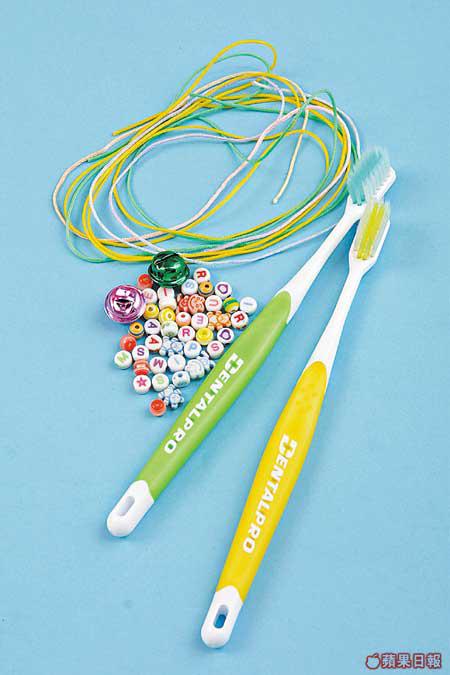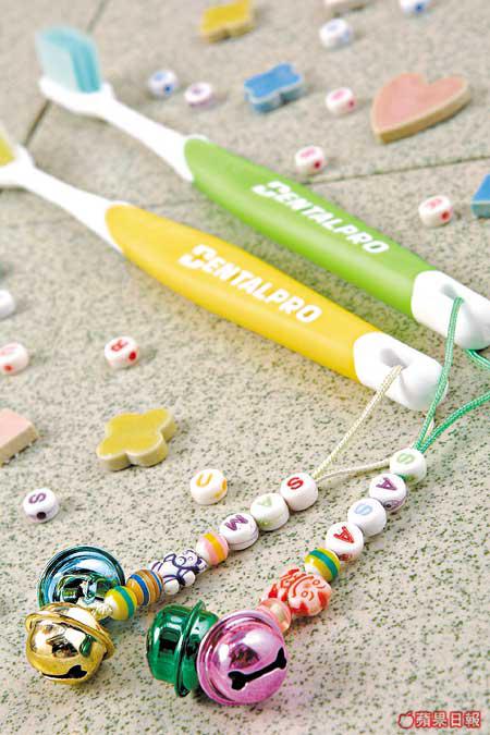 要小朋友乖乖刷牙,不妨為他們穿製一條珠仔牙刷繩。大家還可以在牙刷繩的尾部穿上噹噹,讓小朋友邊刷牙邊聽到噹噹的聲音,每次刷牙自然成為樂事。