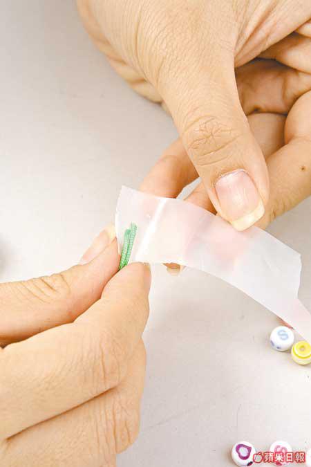 穿珠仔的確費神,有時條繩較粗,很難將珠仔穿入(當然繩的粗度與珠仔窿的闊度相若才行)。有個貼士醒你,只要用條膠紙便可。將膠紙的一半緊貼繩的開口位置,膠紙的另一半則搓成條狀變成針般,不妨將膠紙用雙掌前後搓緊,將「針形」的膠紙往珠仔的窿內一穿便可,十分方便。