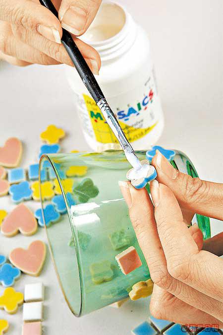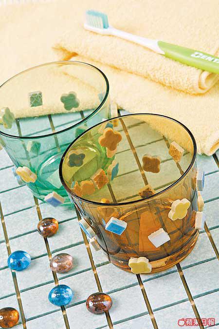 在漱口杯上貼上顏色鮮豔的瓷磚仔,感覺特別又富手感,孩子對充滿色彩的杯自必愛不釋手。另外凹凹凸凸的杯面亦可避免小朋友拿不穩而跣手。