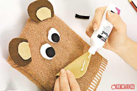 小貼士:毛巾經常沾濕,用一般膠水貼絨布是絕不可能,你可到美勞用品店購買布用膠水,或可購買畫Tee的顏料,但最簡單的方法是用針線,一針一針地縫上,保證濕水或放進洗衣機亦不會「甩頭甩髻」。